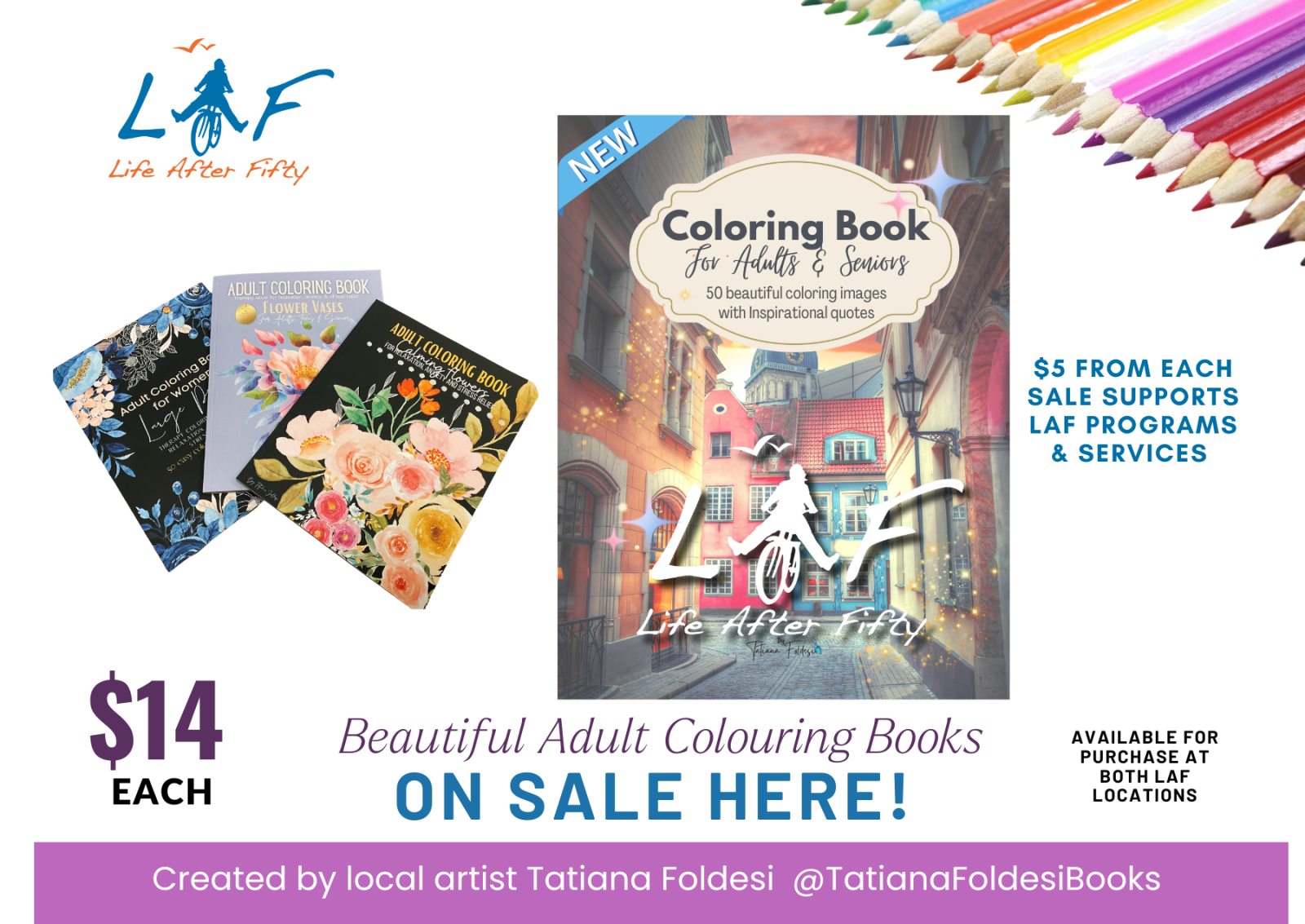 Beautiful Adult Colouring Books - on sale now at LAF. Proceeds support programs & services. $14/ each.